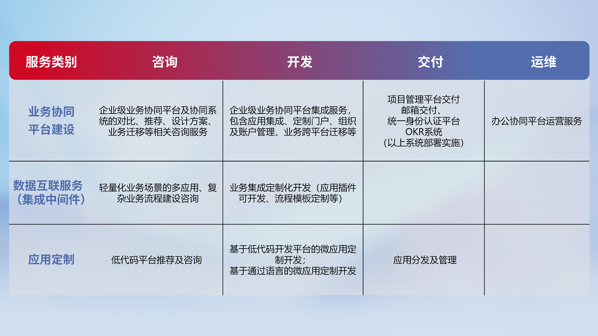 针对钉钉、、企微、、IDaas等平台级产品提供产品的规划、、方案、、交付、、定制化开发等服务,,,,实现如统一协同办公、、、、智能客户服务、、、混合会议管理、、、智能数据查询、、、、等业务场景,,,,实现数字化转型。。